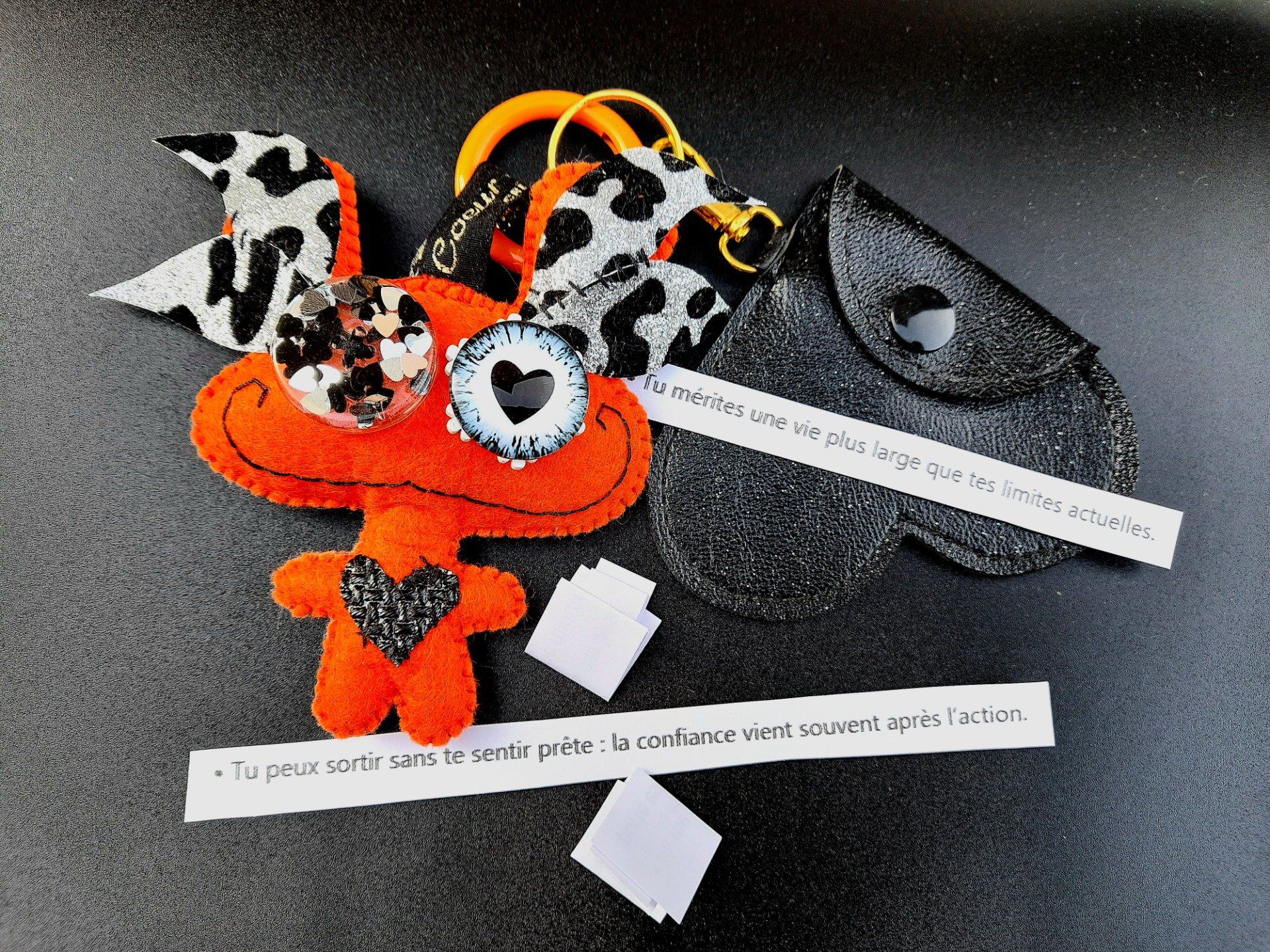 Chaque totem est accompagné d’un porte-clé cœur rempli de messages à piocher dans les moments difficiles : anxiété, agoraphobie, baisse de moral…